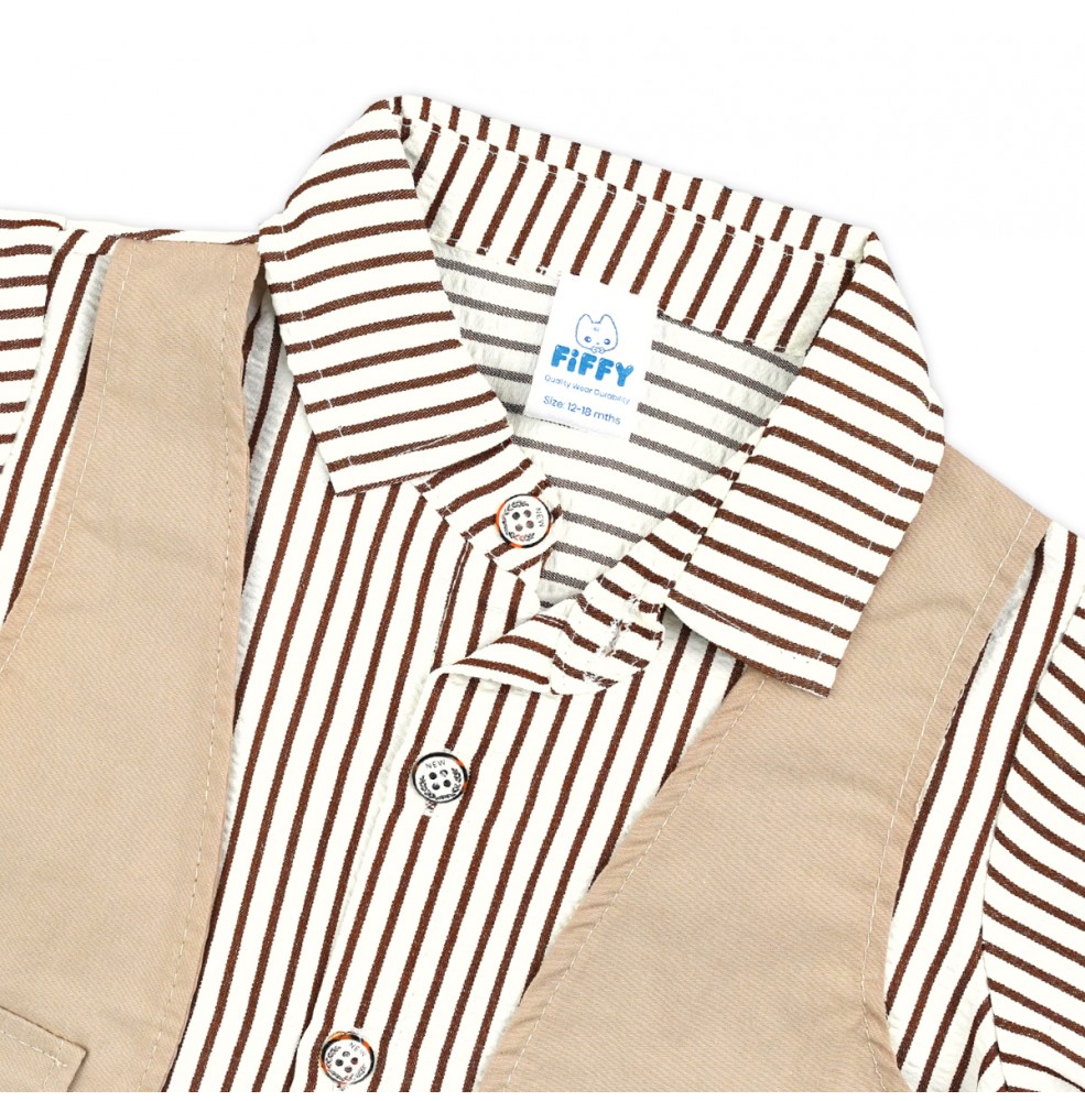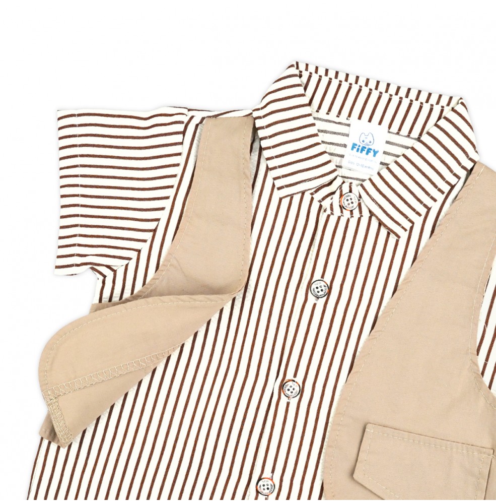 ➤ Classic outfit with striped shirt contrast with solid colour vest, and shorts
